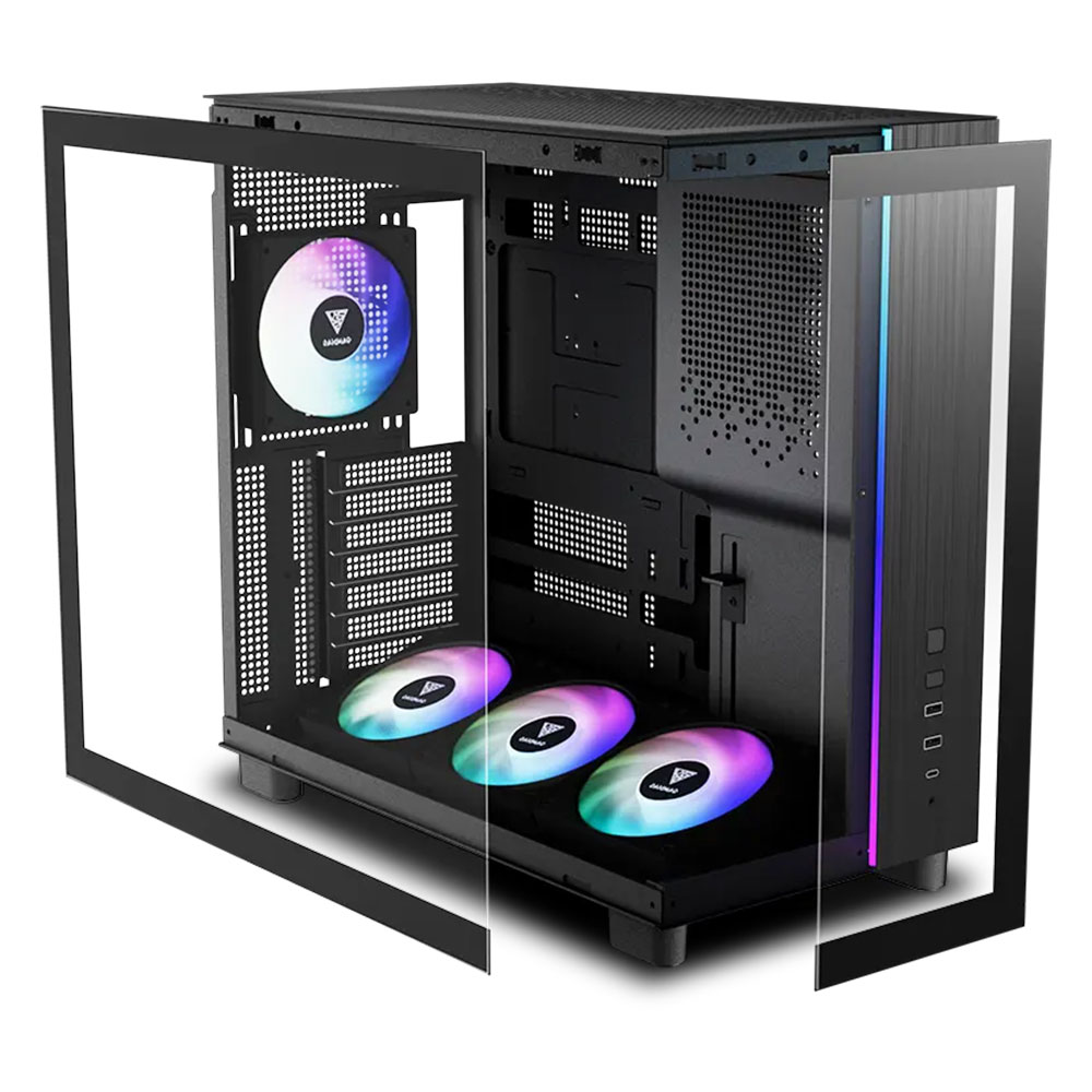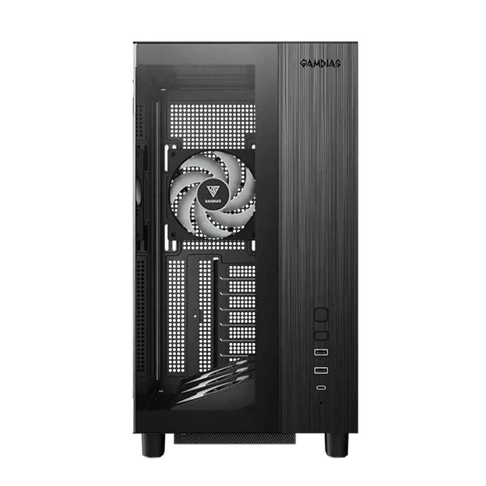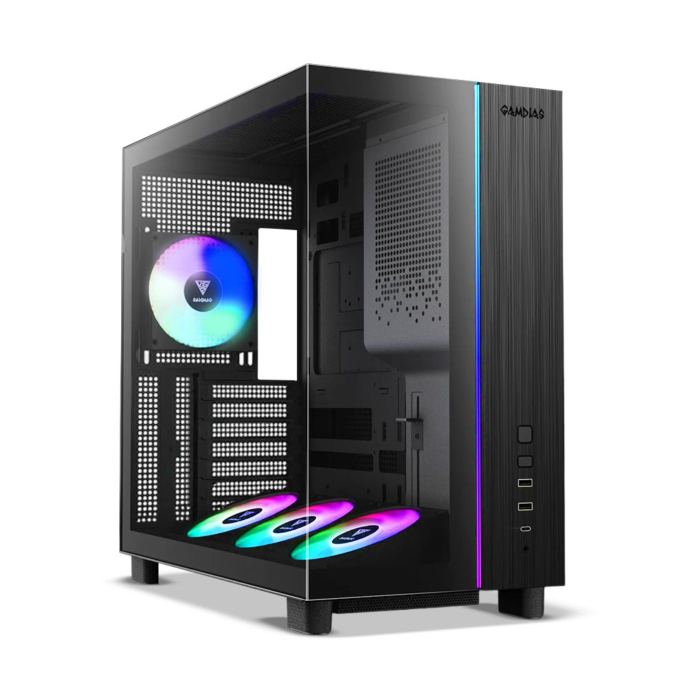 Case Gamdias ATLAS M4 ARGB con diseño panorámico de vidrio templado, alto flujo de aire y compatibilidad ATX, Micro-ATX y Mini-ITX. Ideal para PCs gaming modernos.