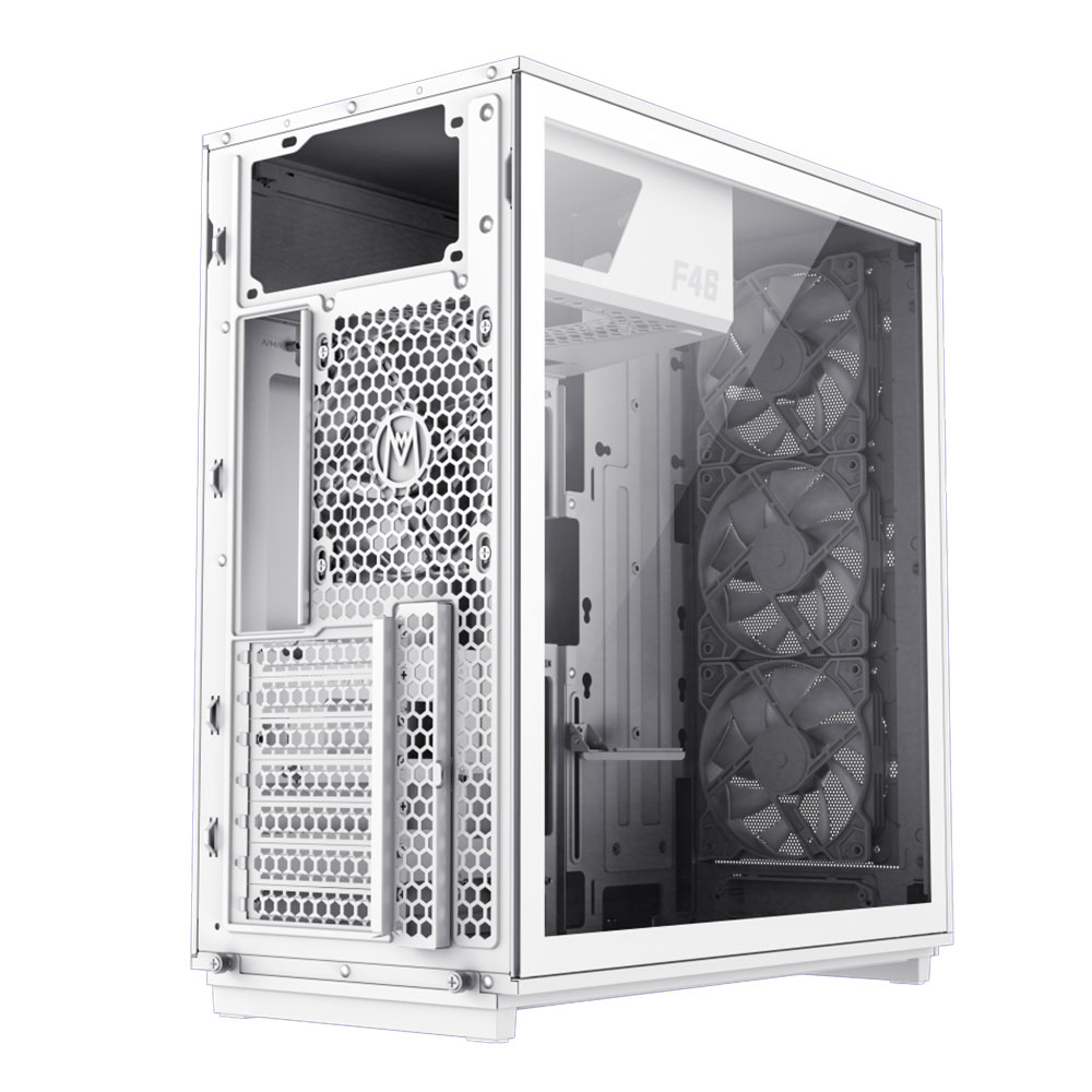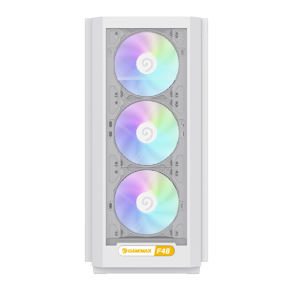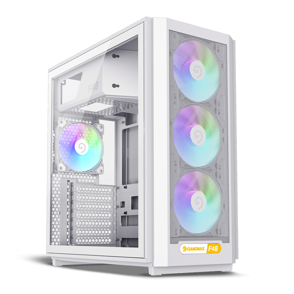 Gabinete Gaming GameMax F46 BK ATX con vidrio templado y ARGB, incluye 4 ventiladores. Alto flujo de aire y soporte para refrigeración líquida hasta 360 mm.