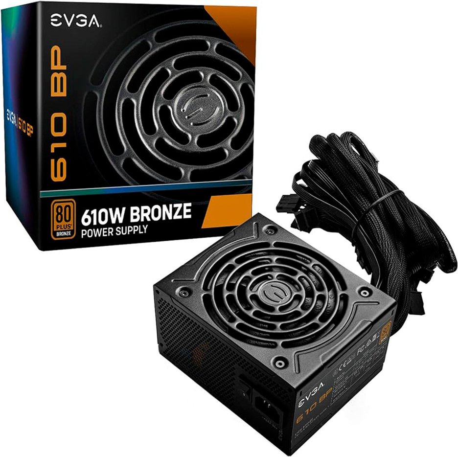 Fuente de poder EVGA 610BP con certificación 80 Plus Bronze, ofrece alta eficiencia y estabilidad para tu sistema.