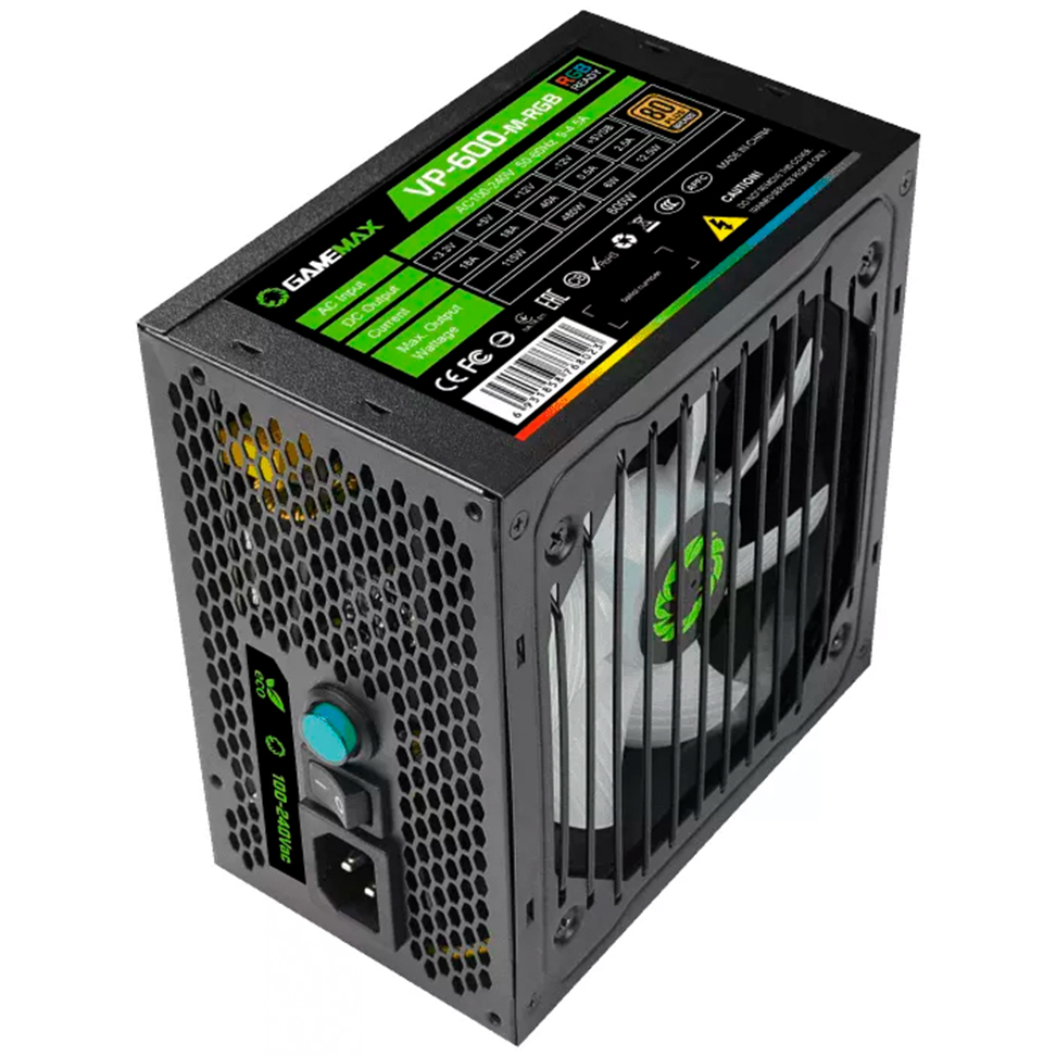 Fuente de poder Gamemax VP-600 GRB con certificación 80 Plus APFC, 600W, diseño en color negro, eficiencia energética garantizada.