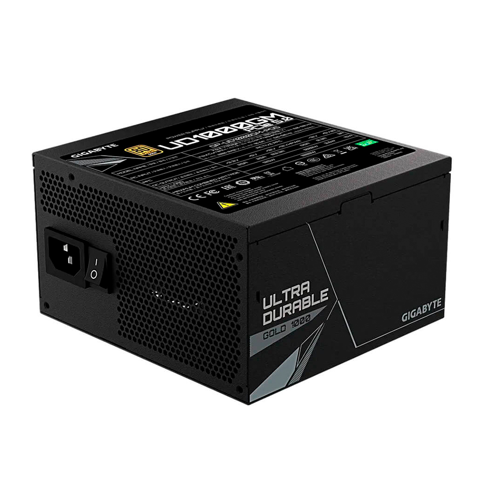 Fuente de poder Gigabyte UD1000GM PCIe 5.0 de 1000W, totalmente modular y con certificación 80 Plus Gold, optimizada para configuraciones avanzadas de PC.