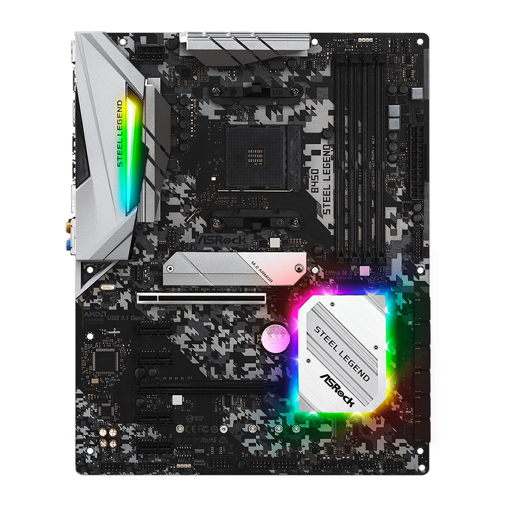 Placa base Asrock B450M Steel Legend con socket AM4, DDR4 hasta 128GB, 2 ranuras PCIe, HDMI y DisplayPort, soporte de gráficos avanzados.