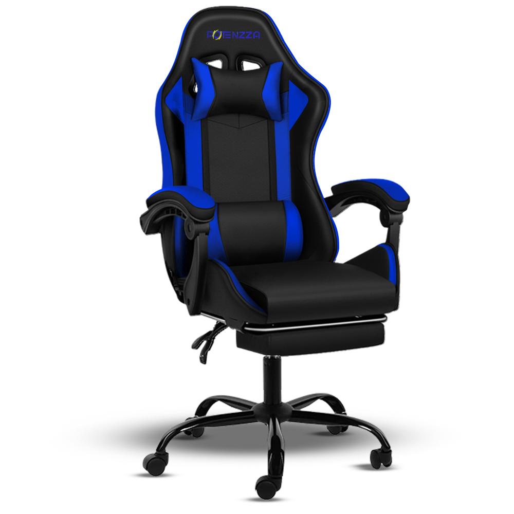 Silla Gamer Potenzza FH0037-PRO color negro y azul ergonómica y transpirable, fabricada con cuerina, con reposacabezas 2D ajustable, ajuste de altura, reclinación con el propio peso y reposapiés retráctil. Ideal para gaming, oficina y largas jornadas frente al escritorio.