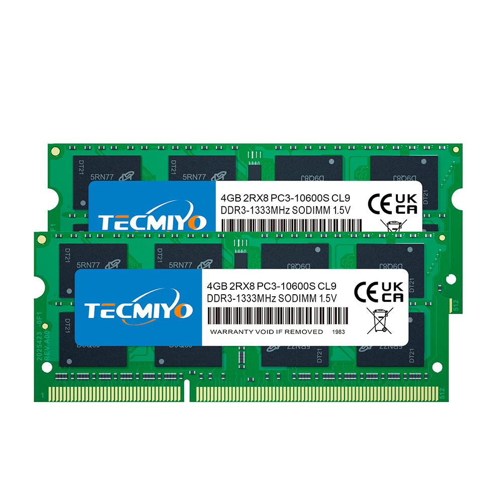 Memoria RAM SO-DIMM Tecmiyo de 4GB DDR3-10600S, 1333MHz, compatible con laptops de generaciones anteriores.