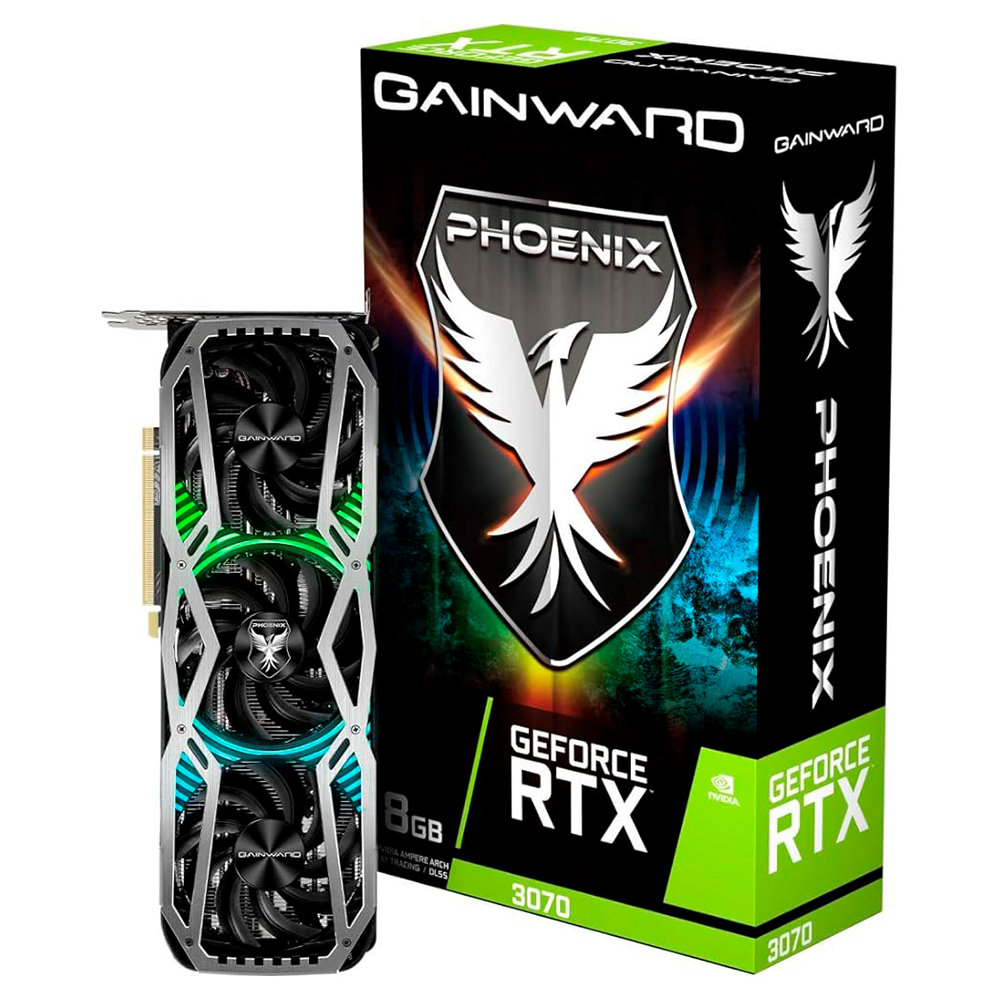 Tarjeta gráfica Gainward Phoenix RTX 3070 con 8GB GDDR6, triple ventilador RGB, soporte para juegos en 1440p y 4K con alto rendimiento.
