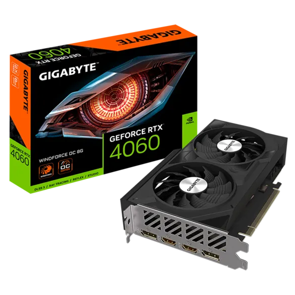 Tarjeta gráfica Gigabyte Geforce Windforce OC RTX 4060, 8GB GDDR6, 2 ventiladores, rendimiento excelente para juegos y diseño, 2 puertos Display Port, 2 puerto HDMI, Color Black.