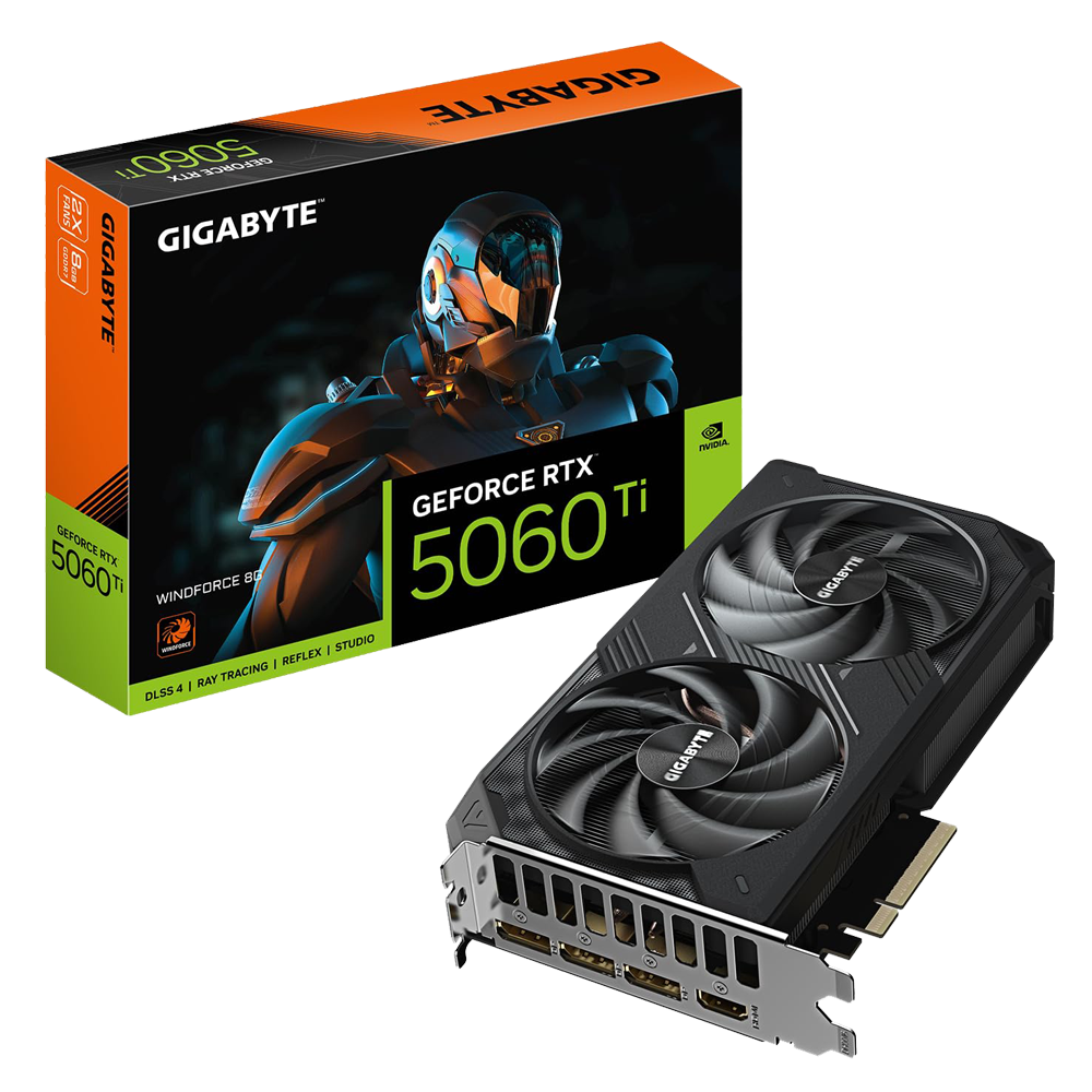 Tarjeta gráfica Gigabyte Geforce Windforce OC RTX 5060 Ti, 8GB GDDR7, 2 ventiladores, rendimiento excelente para juegos y diseño, 3 puertos Display Port, 1 puerto HDMI, Color Black.