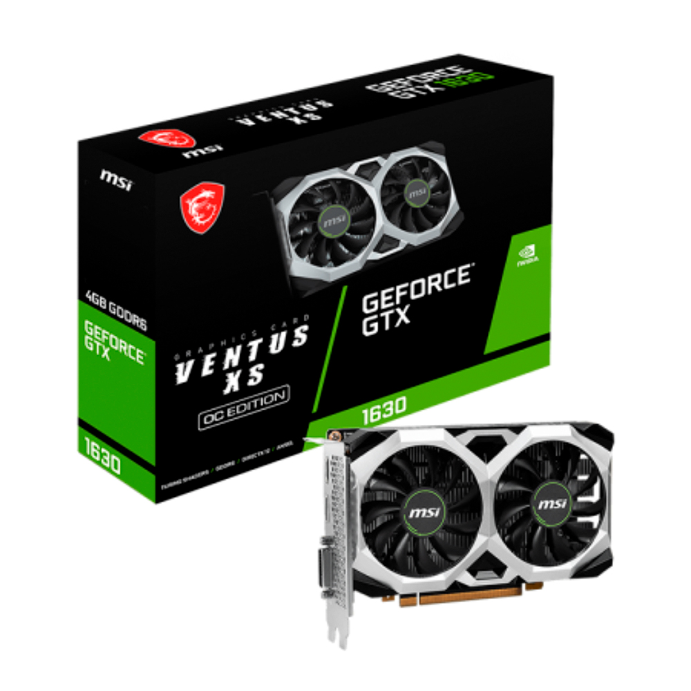 Tarjeta de video MSI GTX-1630 Ventus XS OC con 4GB GDDR5, 2 ventiladores, HDMI, DP y DVI, diseñada para gaming y multimedia.